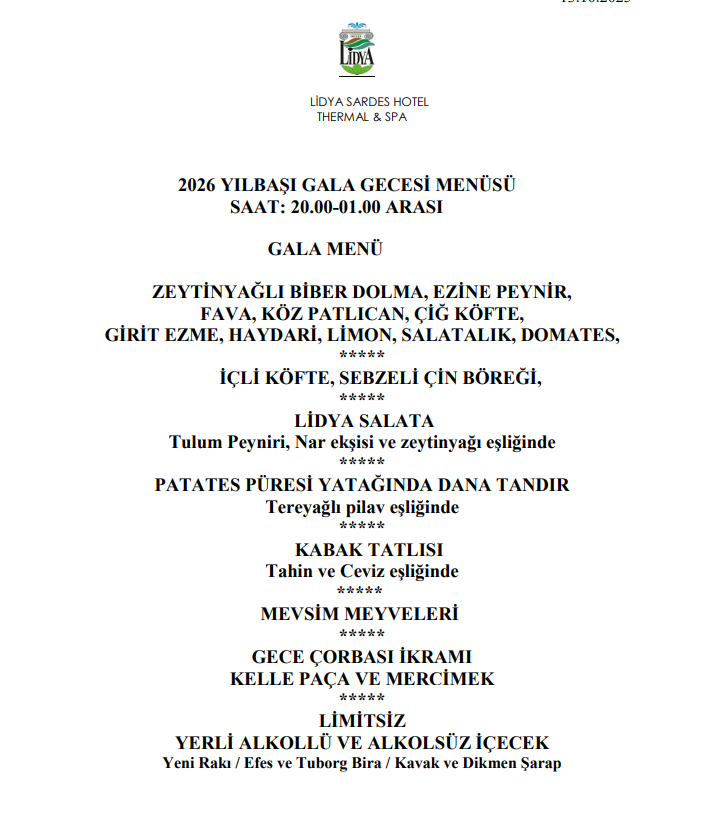 31.12.2025 Gala Yemeğine Limitsiz Yerli Alkollü ve Alkolsüz içecekler dâhildir.